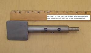 PN 60-5304-719 – SPA 719 – $176.00 is a 3/8-inch stainless steel strainer with Three 3/8-inch holes oriented toward bottom via a 2-inch square plate. It is 7-inches long and is 7/8-inch tall.